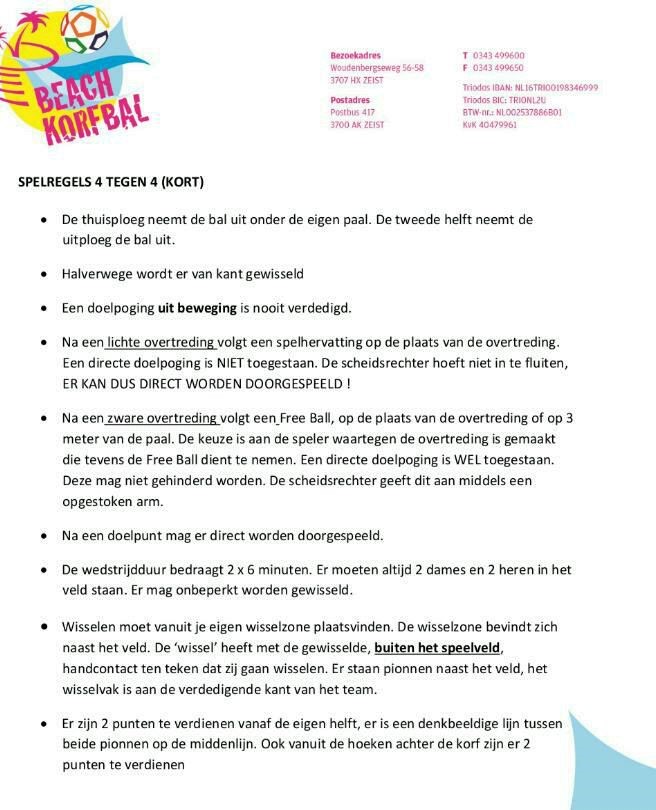 Er zijn 2 permanente beachkorfbalvelden met in hoogte verstelbare palen zodat op alle niveau’s gespeeld kan worden. Naast Vitesse gaan ook de middelbare scholen de velden gebruiken. Zie hieronder de spelregels.